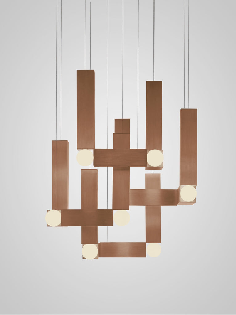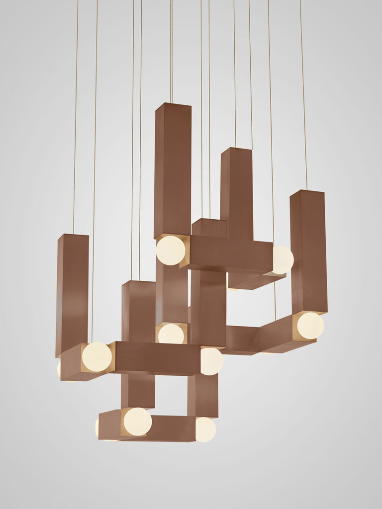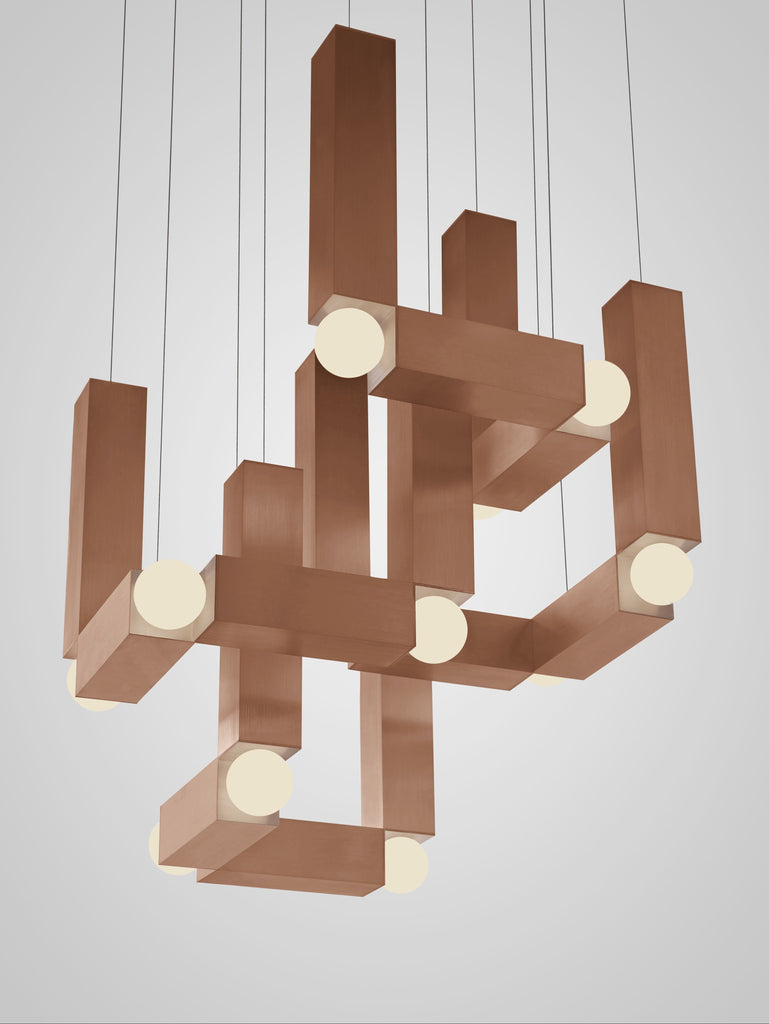 Vesper is inspired by the simple geometric lines of Brutalist sculpture and modernist cathedral lighting. Formed with extruded aluminium and available in anodized gold, bronze or silver, Vesper explores the delicate balance and interconnection of its rectangular cubes that are seamlessly connected by illuminated spheres. The light sculpture, which is suspended by cables, is available in both Duo and Quattro versions.